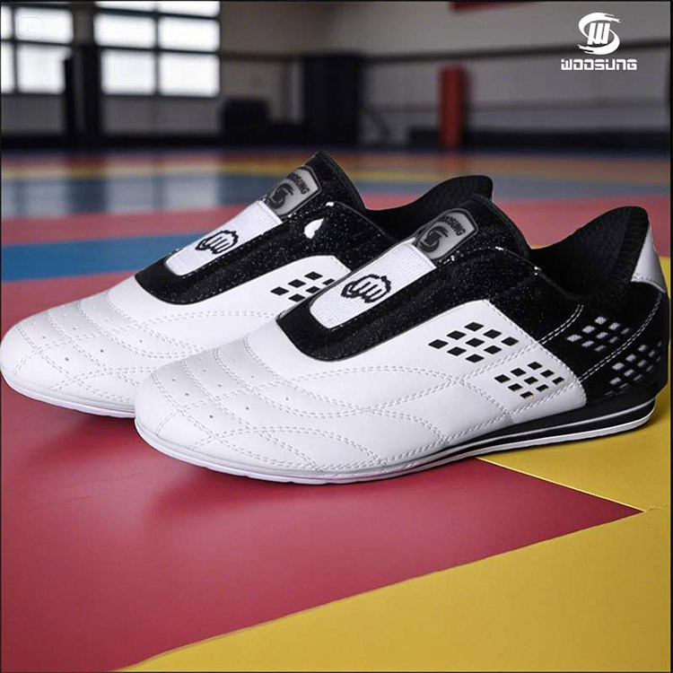 สำหรับรองเท้าเทควันโดสีขาว WOOSUNG ใช้วัสดุสังเคราะห์หรือหนังคุณภาพสูง: